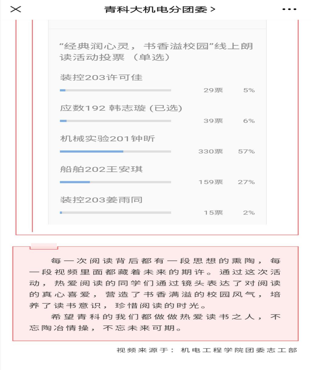 近些年,随着全民朗读热潮的掀起,朗读这一表达形式获得了越来越多人的认可,同学们也踊跃参与,捧起书本,敞开心扉,将自己内心的情感以及远大的抱负通过朗读这一形式表达出来。经过初步评选,协会选出了其中最为优秀的几件作品,并号召全校师生在线上对优秀作品进行了公平公正公开的投票。在全体师生的积极投票参与下,本次活动评选出一、二、三等奖获奖者各一名,并派发了精美奖品。截止到本月16日,本次朗读者活动圆满结束,并获得了师生们的一致认可和好评。